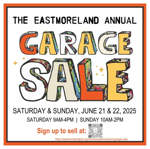 The 2026 Eastmoreland Garage Sale will take place on Saturday, June 27 (9-4) and Sunday, June 28 (10-2).